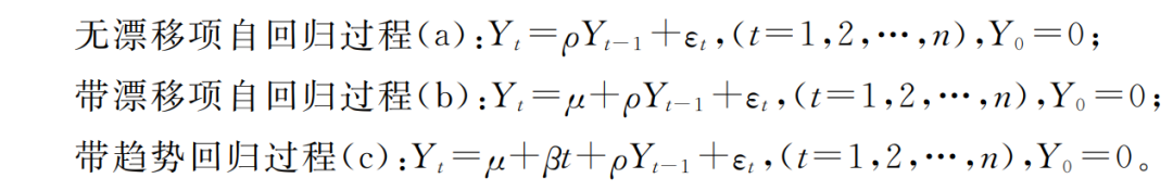 并基于观测的样本时间序列计算t统计量进行检验判断,为单位根检验奠定了理论基础。迪基和弗勒(1979)在研究时间序列的非平稳性时发现,当自回归系数取值范围不同时,模型表示的数据生成过程具有完全不同的经济含义,其相应的统计量也会发生改变,对应的分布性质也会不同。为了更加清晰地阐明非平稳时间序列的特点,迪基和弗勒(1979)基于序列随时间变化的基本特征将其大致归为三类:当序列基本走势呈现无规则上升或下降并反复时,将其归为无漂移项自回归过程;当序列基本走势呈现明显的随时间递增或递减且趋势并不太陡峭时,将其归为带漂移项自回归过程;当序列基本走势随时间快速增长时,则将其归为带趋势项回归过程。用数学公式表示如下:其中α是常数,