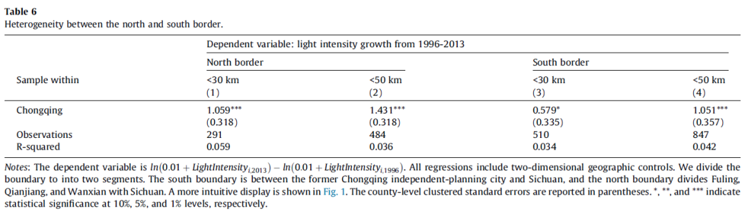 ******Table 9(Panel A)****** gen l_output_pp=ln(output/popu+0.01) gen urbrate=popu_urb/popu gen nonfarmemploy_ratio=employ_23/popu gen l_road_local_pp=ln(road_local/popu+0.01) genl_road_national_pp=ln(road_national/popu+0.01) gen l_school_pp=ln(school/popu+0.01) gen l_hospital_pp=ln(hospital/popu+0.01) winsor2 l_output_pp if distance<=30, trimcuts(1 99) reg l_output_pp_tr new xcenter ycenter ifdistance<=30,cluster(county) reg urbrate new xcenter ycenter ifdistance<=30,cluster(county) reg nonfarmemploy_ratio new xcenter ycenterif distance<=30,cluster(county) reg l_road_local_pp new xcenter ycenter ifdistance<=30,cluster(county) reg l_road_national_pp new xcenter ycenterif distance<=30,cluster(county) reg l_school_pp new xcenter ycenter ifdistance<=30,cluster(county) reg l_hospital_pp new xcenter ycenter ifdistance<=30,cluster(county)******Table 9(Panel B)****** use data_enterprise.dta,clear bys town: egen num2008_a1997=count(x) if birthyr>=1997 bys town: egencom_2008_a1997=max(num2008_a1997) egen position=concat(xcenter ycenter) duplicates drop position,force merge 1:1 position using"data_si_chong.dta" replace com_2008_a1997=0 if com_2008_a1997==. gen lcom_2008_a1997=ln(com_2008_a1997+0.01) reg lcom_2008 new xcenter ycenter ifdistance<=30,cluster(county) use data_enterprise.dta,clear replace new=1 if province=="重庆市" gen r_prof=profit/salemain winsor2 r_prof ,cuts(0.25 99.75) trim gen industry=int(indcode/100) geodist latq lngq near_cy near_cx ,gen(cdistance) reg r_prof_tr new lngq latq i.industry ifcdistance<=30,cluster(county) use data_cencus2005_30km.dta,clear keep if age>=18 & age<=60 reg water new xcenterycenter,cluster(county) reg nonfarm_emp new xcenterycenter,cluster(county)![]()