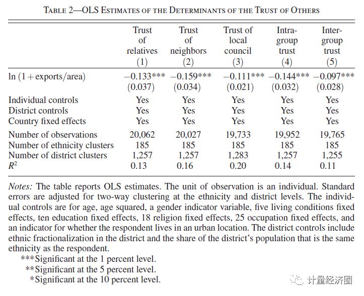 OLS回归结果。注意,作者回报了三种类标准误。被解释变量是对邻里的信任度。
