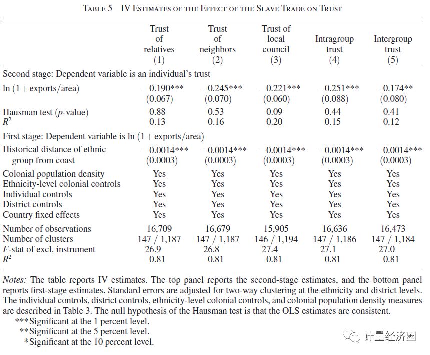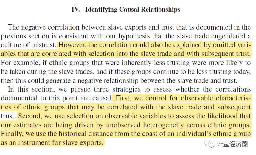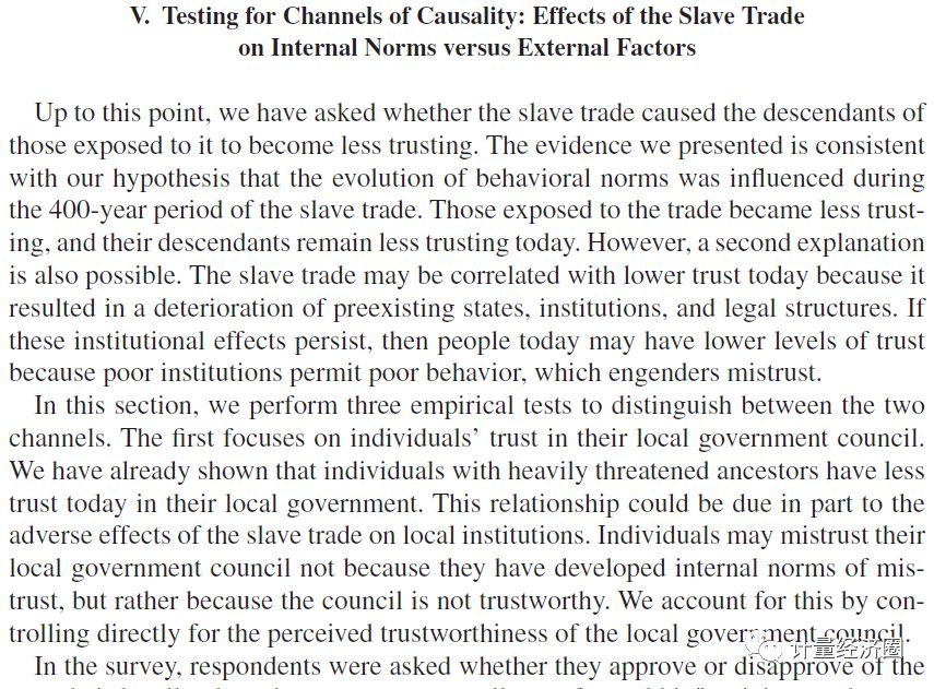 前面都是相关性分析,还不能确定奴隶贸易对信任的负面影响为因果关系。