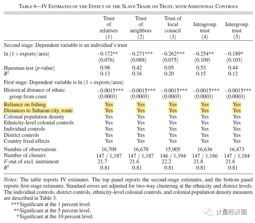 为进一步验证IV的合理性,作者做了两个证伪检验falsification tests。在非洲样本中,与海岸线的距离与当下人们对政府信任显著正相关,因为与海岸线的距离会通过奴隶贸易从而影响当下人们对政府的信任。那在没有奴隶贸易的亚洲样本中,与海岸线的距离就不会与当下人们对政府信任有相关关系。