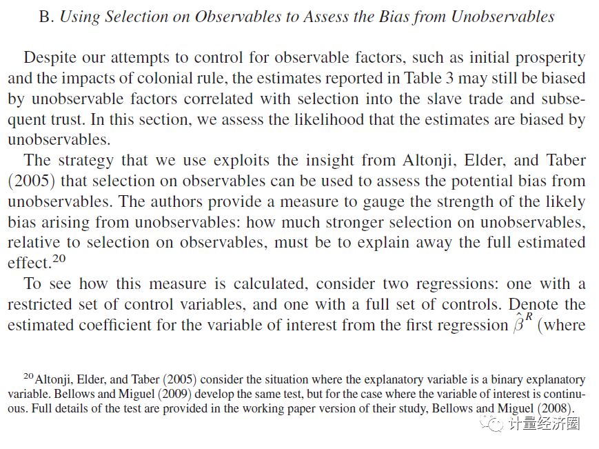 作者通过可观测变量的回归来评估不可观测变量所导致的估计偏误问题严重性。主要是借鉴这篇文章的思路“因果推断中遗漏不可观测变量多严重? 通过可观测变量检测”。考虑到它的重要性,咱们把文章里方法介绍列出来,可以简易学习一下。