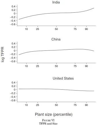 前文分析中假定,所有商品在行业内(更不用说跨行业)具有相同的加价。然而,实际情况中,大型工厂的加价可能更高,而且我们中国和印度的数据可能比美国数据的规模分散性更大。当然,加价也是扭曲的,但它们的差异可能并不完全反映出两国之间的政策差异。下图显示,在印度,TFPR在工厂大小百分比(附加值)中显著增加,在中国工厂大小中略微增加,在美国随着工厂大小而减少。如果线性需求适用于所有地方,那么在美国TFPR也应该随着规模的增加而增加。因此,工厂规模加价是一个可能的解释。![]()