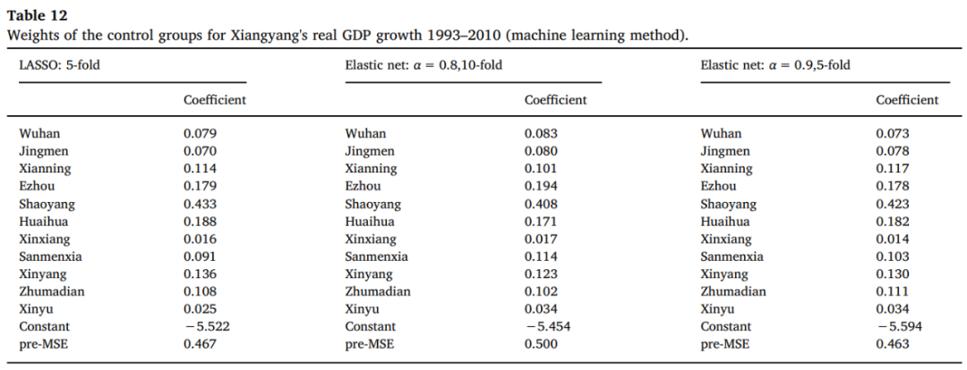 表12中报告的估计权重在不同的机器学习方法中略有不同。邵阳的相关系数最高,权重最大。同样的结果也出现在面板数据方法中。