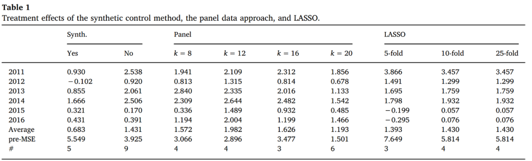 表13显示了使用不同机器学习方法估计的treatment effect。ATE约为2%。这一结果高于面板数据法,面板数据法是合成控制法和机器学习方法的平均值。