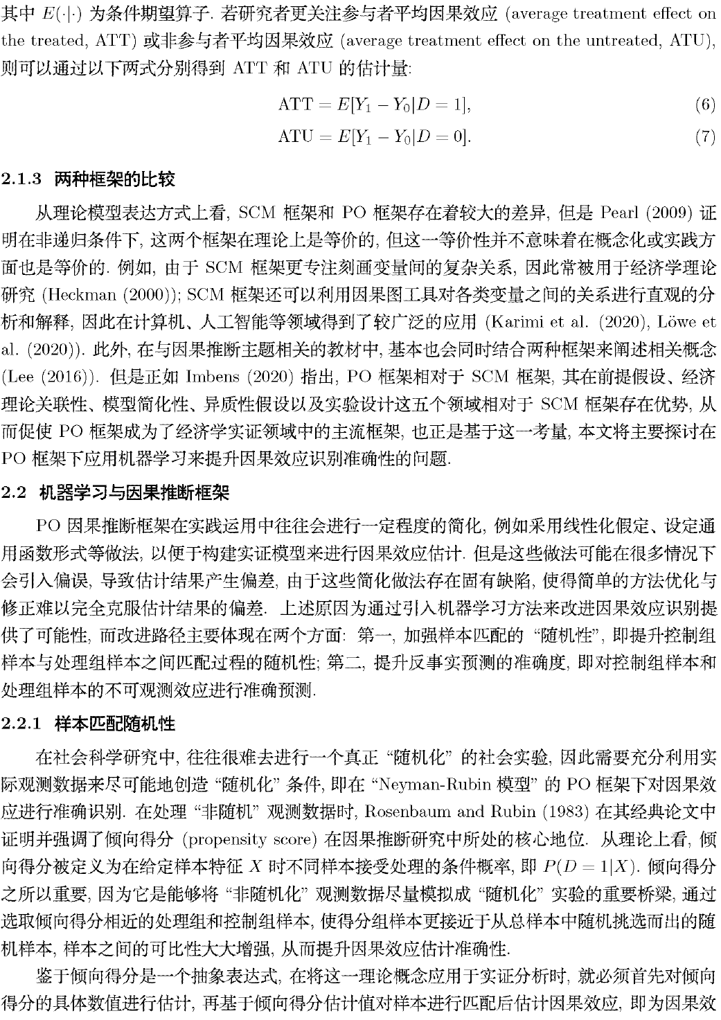 钱浩祺,龚嫣然,吴力波.更精确的因果效应识别:基于机器学习的视角[J].计量经济学报,2021,1(04). 在传统计量经济方法学中引入机器学习方法已逐渐成为一个不可忽视的重要发展趋势, 本文从因果推断的两大主流分析框架出发, 分析了其各自的特征与内在关联,在此基础上, 提出了机器学习方法可以从样本匹配与反事实预测两个方面对现有因果效应识别研究进行改进. 本文认为, 机器学习能够通过样本直接匹配以及提升倾向得分估计准确度来实现样本的精准匹配, 使研究样本更具备"随机化” 实验的特征, 此外,机器学习方法能够利用复杂关系建模、交叉验证以及正则化等方法来提升样本反事实预测的准确性. 本文接着从匹配法、断点回归法、双重差分法以及合成控制法这四个具体的方法出发, 详细阐述了机器学习在提升因果效应识别方面的理论基础, 同时在每一个方法部分都给出了若干实际应用案例, 以供应用计量研究者借鉴和参考.