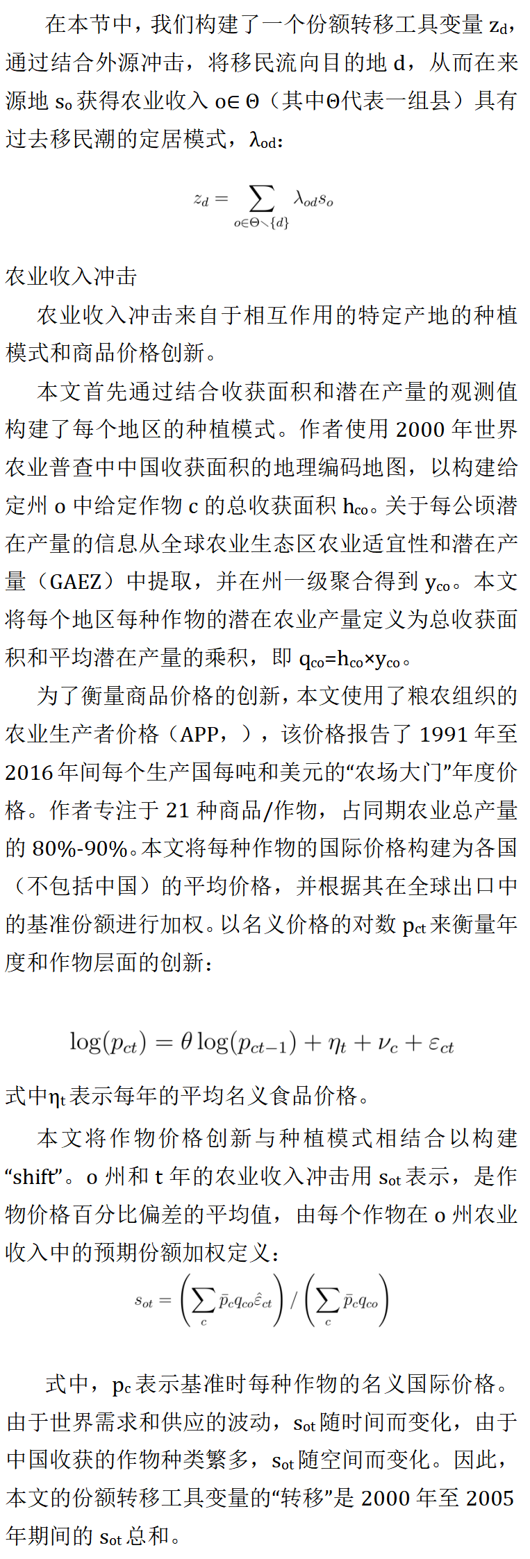 本文通过将不同来源的农业收入冲击与早期劳动力流动模式相结合,构建了本文的份额转移工具变量:![]()