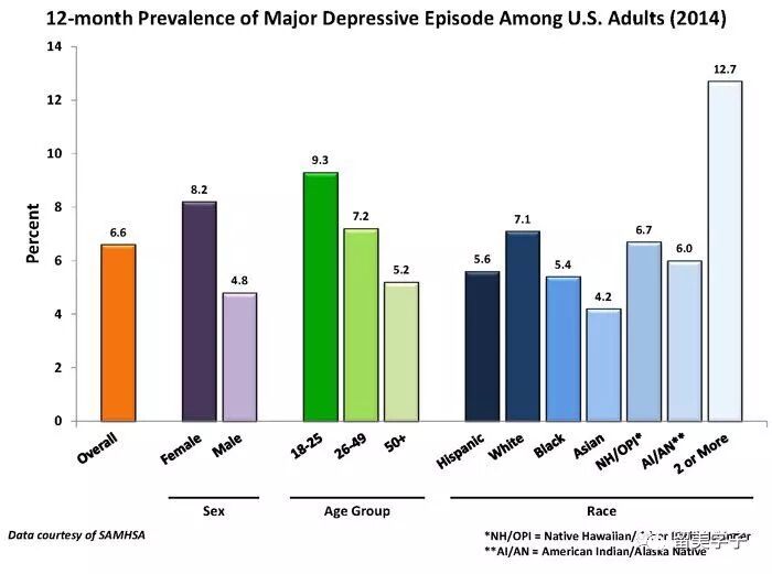 美国国家精神中心对成人一年的统计数据显示:1. 整体发病率是6.6%;2.女性高于男性约一倍;3. 青年(18-25岁)的发病率最高,接近10%;4. 亚裔最低4.2%;5. 最高的是两个族裔以上混血的人12.7%。
