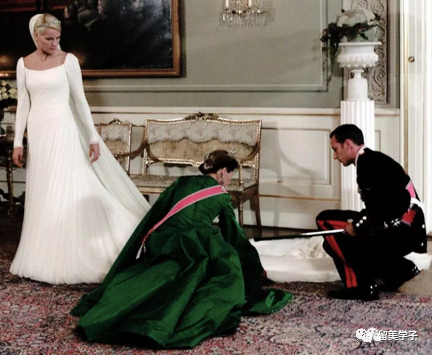宋雅王后在婚礼前俯身为梅特整理裙摆