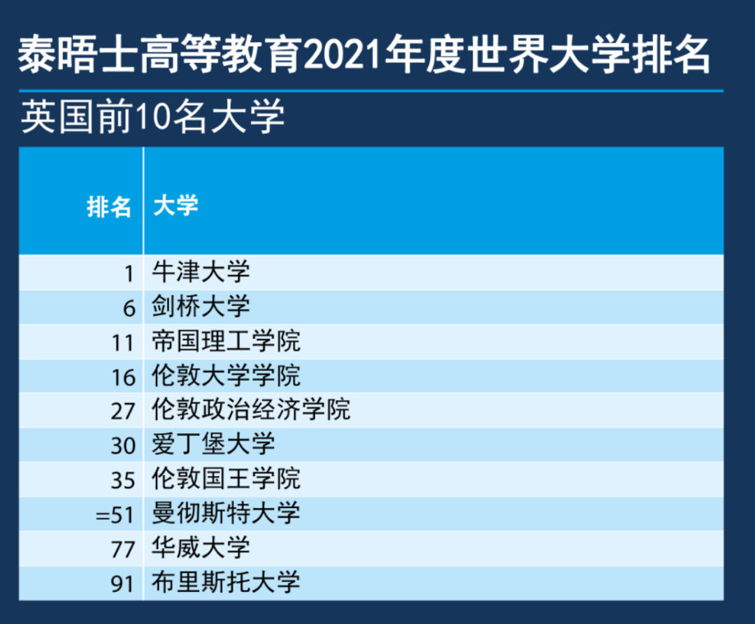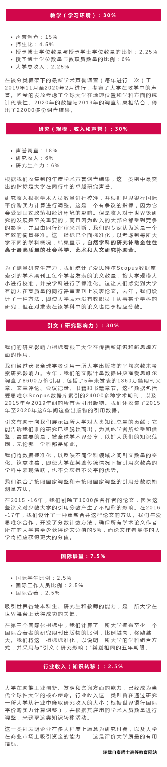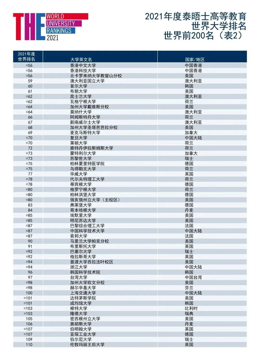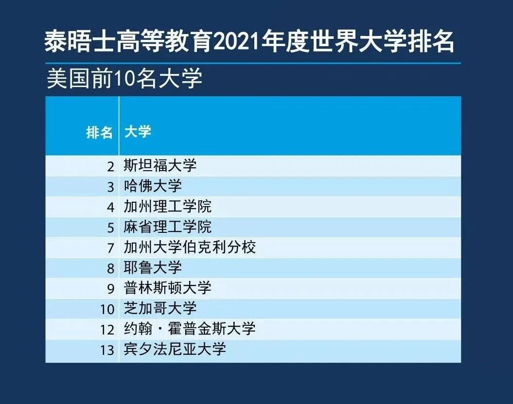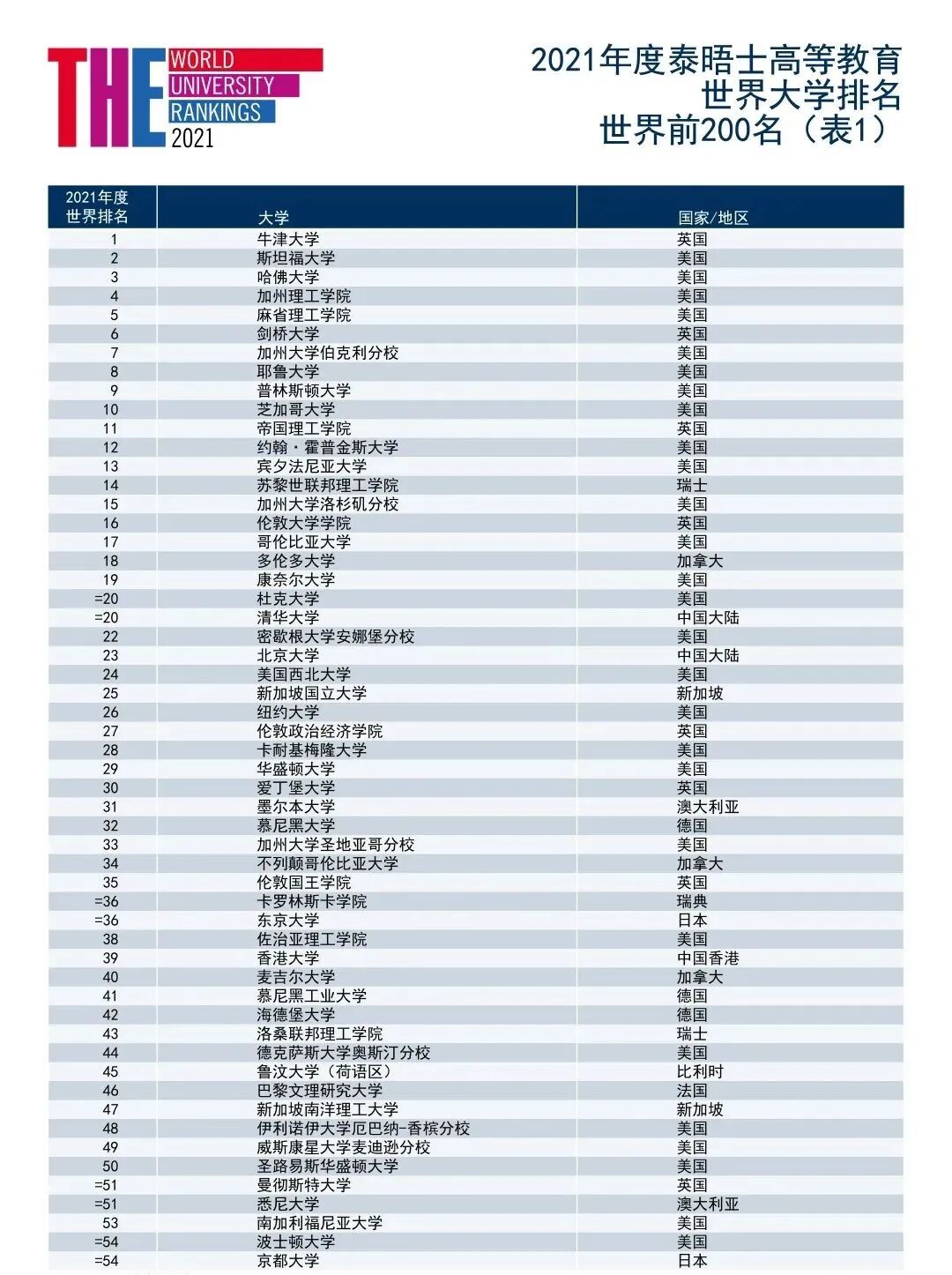 https://www.timeshighereducation.com/cn/world-university-rankings/2021/world-ranking/从以上信息里,我们不仅了解了中国大学在世界大学的位置,也巡礼了全世界的顶尖大学各自所处的位置。同时也发现:泰晤士教育的排名方式,有它自身的偏重评价指标和体系,与其他种类、其他评价机构有区别。本期内容仅供参考, 其他方式的世界大学排名,也纷纷出炉、正在公布中。 所以,申请大学可以参考泰晤士教育的排名,还可以参考其他几类不同形式的排名,综合因素全面考虑,方能寻觅到最适合自己的大学学府!参考北美留学酱、青塔、泰晤士教育等【留美学子】综合汇编·无任何商业链接