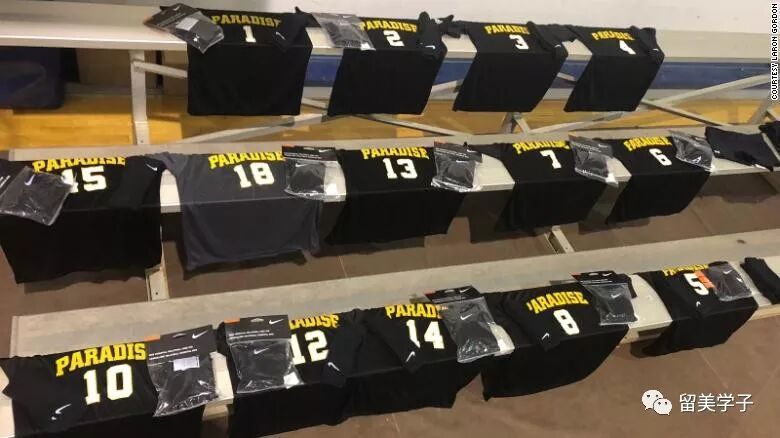 森林湖基督教学校,她们比赛对手的学校,为她们定制了全部比赛装备,并且整整齐齐的放在看台上,其中包括队服、护膝、运动鞋、运动袜,连球员学校的名字和队员各自的编号,也都印在队服上。