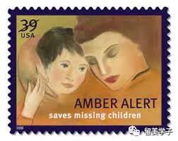 这张39美分的邮票上的图案是由艺术家薇薇安·费列雪(Vivienne Flesher)用粉彩绘制的,画中是一对重聚的母子,票面下方并印有“AMBER ALERT saves missing children”(安珀警报拯救失踪的孩子)的字样。