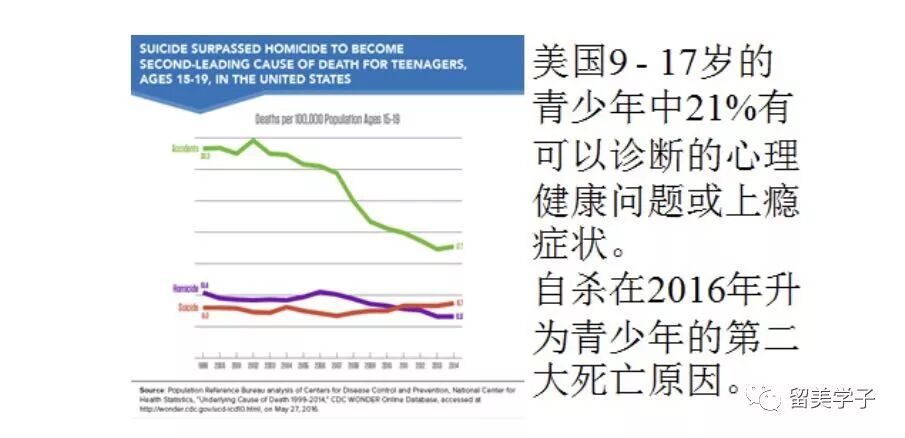 美国情况更严重,9 到 17岁的青少年中21%有可以诊断的心理健康问题或上瘾症状。大约10.7% 的美国青少年有抑郁症 ,5.9%有严重焦虑症状 , 而自杀在2016年升为青少年的第二大死亡原因 。