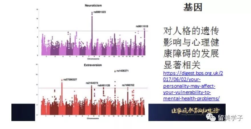 双胞胎和家庭研究发现,我们的人格大概40%左右来自于遗传。积极心理学关于乐观等和心理健康相关显著的因素研究也发现,基因的影响高达50%左右。一项自然遗传学的研究,分析了几十万人的基因组, 发现许多与人格有关的基因变异,也和精神健康障碍的发生有关。与神经质得分呈正相关的位于8号染色体一个区域的基因,与神经系统的发育和发育神经精神障碍有关。另一个与外倾性相关的位于12号染色一个区域的基因,在双相情感障碍遗传研究中显得很突出。
