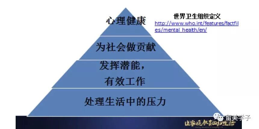 世界卫生组织把心理健康定义为“个人可以发挥潜能,处理生活中的压力,有效工作,为社区做贡献的状态” 。
