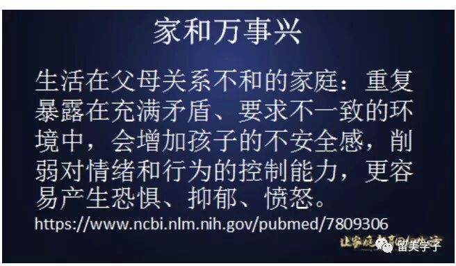 而我的父母是小吵天天有,大吵三六九,逢年过节吵得更凶。生活在父母关系不和的家庭:重复暴露在充满矛盾、要求总不一致的环境中,会增加孩子的不安全感,削弱对情绪和行为的控制能力,更容易产生恐惧、抑郁、愤怒的感觉 。父母之间长期冲突,无论是否离异,与孩子的焦虑和问题行为都成正相关,和健康成负相关。孩子暴露在冲突中的时间越长,负性情绪越多,相应的行为反应,比如攻击性行为,也越多;成年后的亲密关系更为脆弱,更可能离异。
