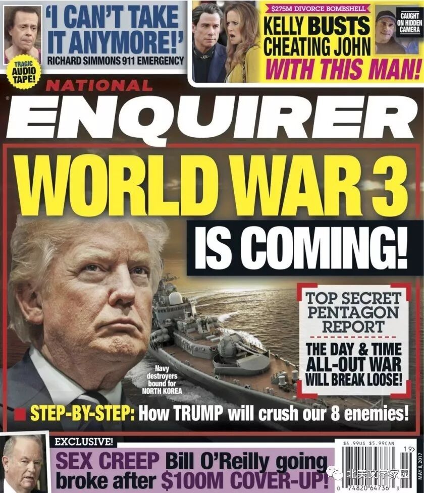 每次上超市,视觉总要被结账柜台边的《国家询问报》冲击一回。这份小报的名字大得吓人,封面标题更是耸人听闻:“米歇尔的秘密离婚档案”,配上奥巴马和夫人绷紧脸的特写镜头;“希拉里只能活6个月了”,配上她泡肿脸的照片;“第三次世界大战即将打响”,配上特朗普总统和战舰的相片。小报的老总大卫·培克对封面极其重视,每期都亲自坐镇拍板。