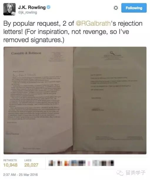 下面是J.K自己公开的拒信,公开目的不是为了报复,而是激励人们更加努力奋争: