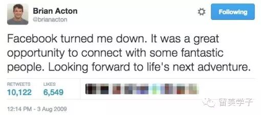另外一个励志故事,还记得 2014 年被 Facebook 以 190 亿美元收购的 Whatsapp 吗? Whatsapp的创始人 名叫 Brian Action, 2009 年 他曾去 Facebook、Twitter 等公司应聘,结果被这些公司拒绝聘用,他却把一切看作给予他前行的更大机会。