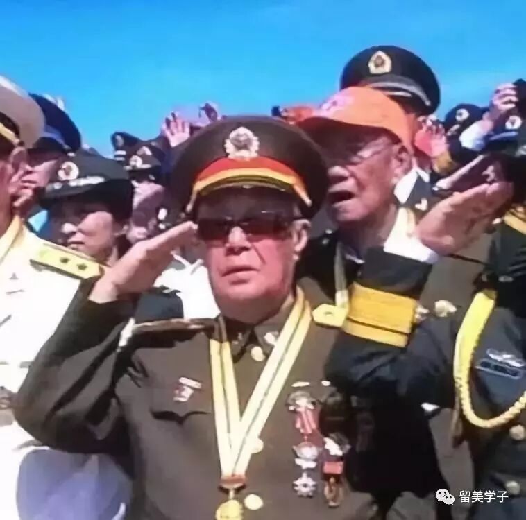 在纪念抗日战争胜利七十周年的阅兵观礼台上,爸爸以军姿立正向经过天安门的抗战老兵行军礼的镜头,在中央电视台播放多次,我在洛杉矶观看阅兵时,当看到爸爸在观礼台上的身影,激动万分,从ipad上截下了这张无比珍贵的照片。
