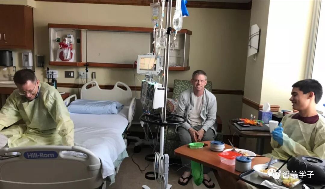 先生胃口不好,根本无法吃医院的饭,只能喝巧克力口味的蛋白饮料。这可难不倒送饭团的朋友们,她们每天都送来不同口味的各式汤菜,他东一口西一口地吃了不少,移植后的前5天,一磅体重也没减,精神也特别好。有的朋友做的饭菜量很大,成锅的汤、一大铝箔盒的菜、煎饺、捞面等,我就分享给护士们。整个楼层,甚至其它楼层的护士都知道先生和他太太送的瓜果蔬菜及美味佳肴。每次去病房,护士们见到我都是笑盈盈的,主动汇报先生的情况。