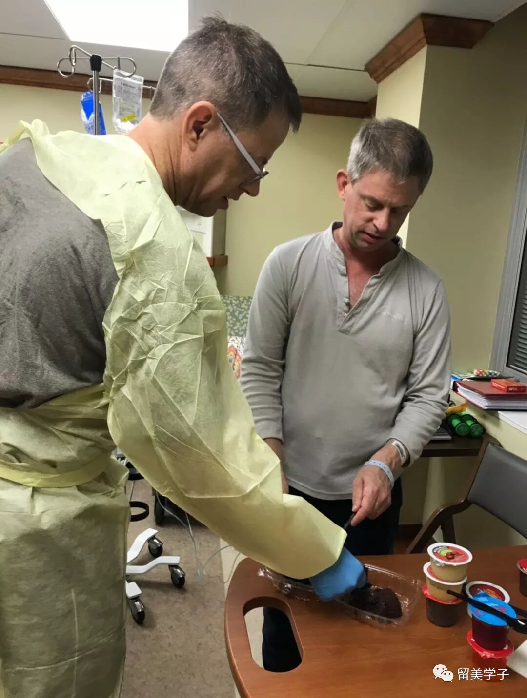 这时,小叔子也要出院了,我赶紧过去帮他收拾东西,带他过来看先生。哥俩有说有笑,仿佛什么也没发生过。护士送来了一个小生日蛋糕,盒子上写着“Happy Stem Cell Birthday!(干细胞生日快乐!)”今天,先生零岁。