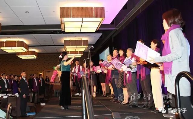 全场校友齐唱校歌。“西山苍苍,东海茫茫,吾校庄严,岿然中央……”当深情地唱起校歌,当披上清华校色围巾,当戴上写有姓名和年级的红纸条……这一刻,现场每一个人因为一个共同的身份而自豪——“我是清华人!”