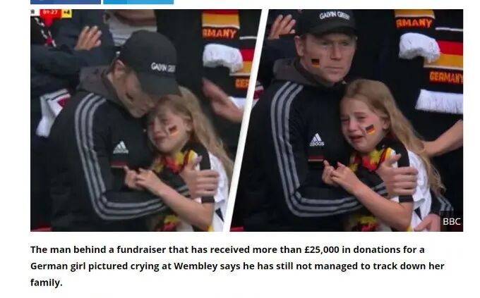 与家人一起在观众席上观看欧洲杯16强的比赛,身穿德国队服的德国小女孩,原本信心满满期待德国再次赢得战局,结果却经历英格兰2比0淘汰了德国、德国惨败,英格兰晋级8强。
