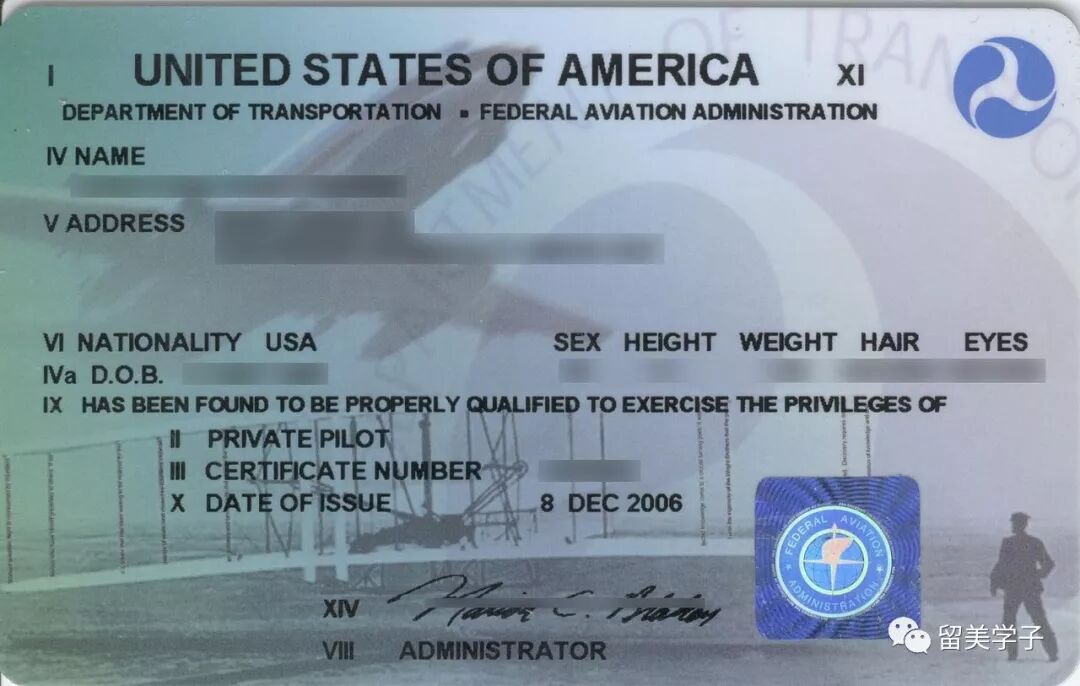 私人飞行驾照样板。