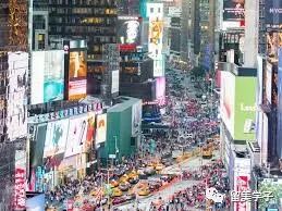 百老汇和第七大道从曼哈顿上城冲下来,在45 街相撞,交叉而过,这交叉处就是纽约著名的时代广场。在昨天以前它根本算不上个广场,就是个交叉街口而已。可是人们喜欢来这里,来这个商店多、剧院多、犯罪多、警员多、故事也多的拥挤的交叉街口。满眼的广告、霓虹灯、巨大而锐目的荧幕,是人们不得不来这里的又一大原因。近一个多世纪,自西方广告业在大都市大行其道后,时代广场就一直是先驱,今天更是现代广告展示的大平台。