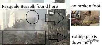 在世贸大楼倒下之时,Buzzelli 先生竟然在楼底角落(如上图所示),奇迹般的生存下来,这是当时在数千人死亡者中间,为数几位的幸存者,给那个最悲剧黑暗的时刻,带给千万民众一丝光亮和希望。