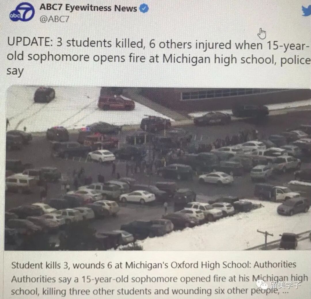 据CNN报道,美国时间2021年11月30日周二下午12时50分左右,密歇根州牛津市的一所高中发生枪击事件,枪手大约发射了 15 到 20 发子弹,造成学生和老师3人死亡、6人受伤。当地的警长说,嫌疑人是15岁的男学生。嫌疑人在警察到达后五分钟内被逮捕。