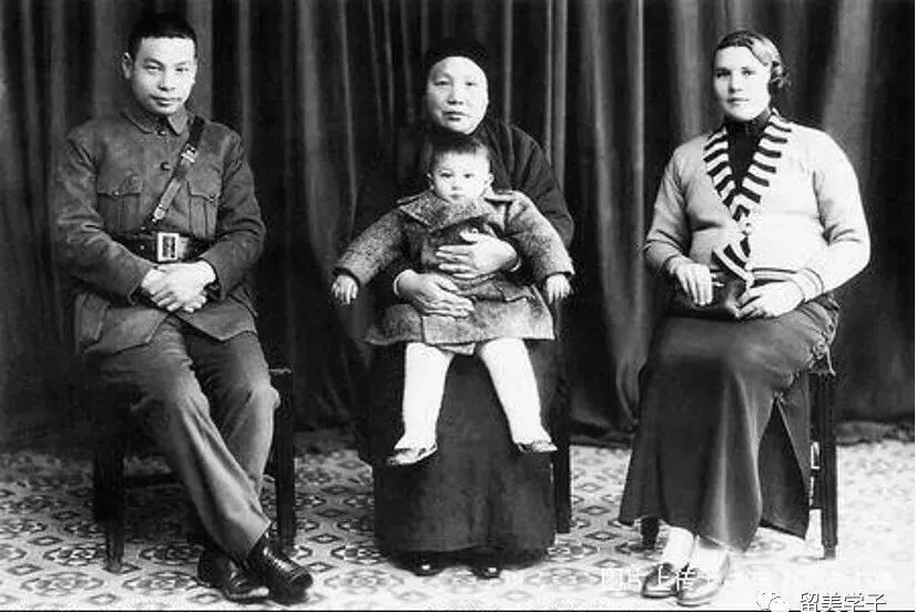 1937 年返国后两人与蒋经国生母毛福梅(抱着长孙蒋孝文)在宁波拍的。