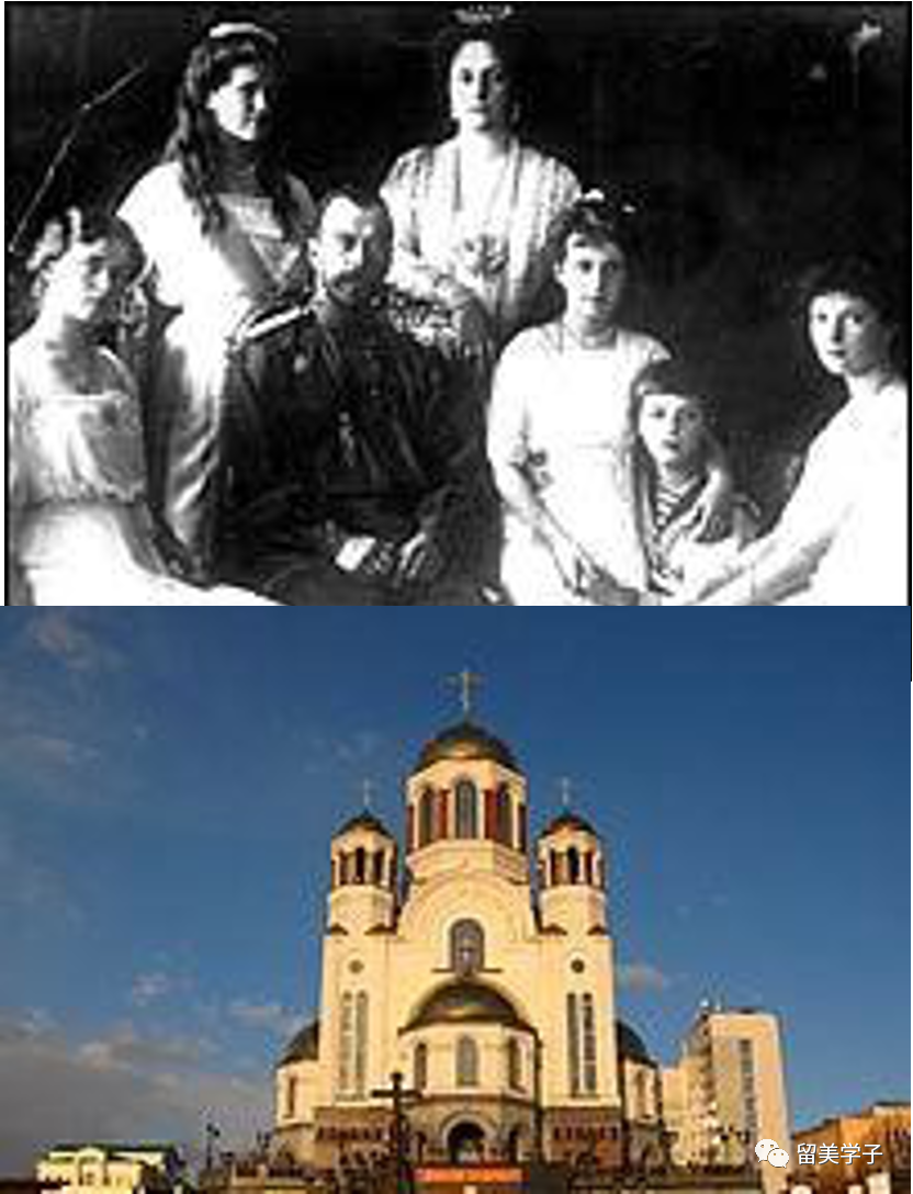 1918 年 7 月 17 日凌晨,布尔什维克共产主义者在伊帕季耶维奇公寓,秘密枪决了沙皇尼古拉二世和他的妻子及 5 个子女(如第一图),他们的尸体被浇上硫酸和汽油焚毁,残余骨渣也被秘密埋藏。人们为了纪念他以及这一残酷的历史事件,在此处建立了“滴血教堂”,名称为“Church on Blood in Honor of All Saints Resplendent in the Russian Land“(如第二及第三图)。