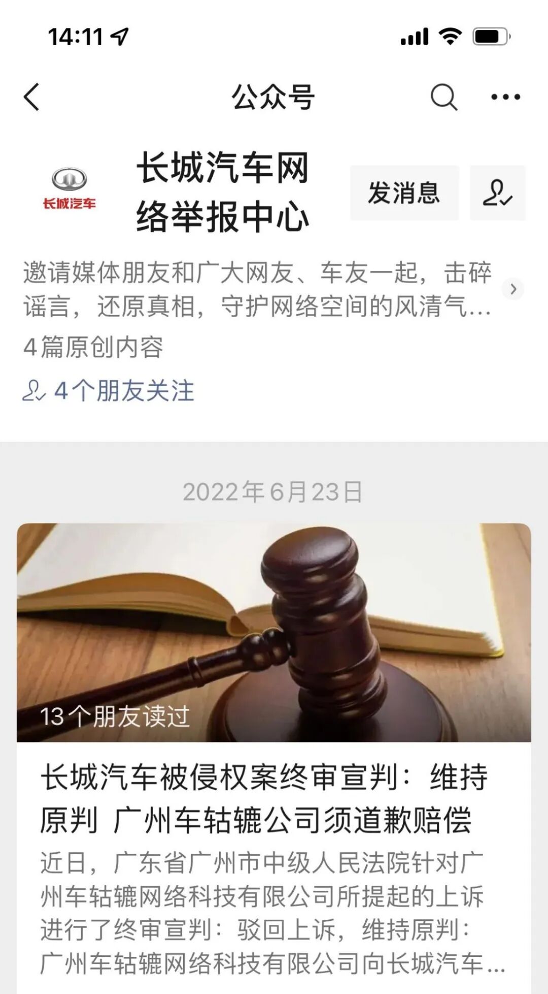 2021年8月底,广州互联网法院对小鹏汽车起诉自媒体“车知事”网络侵权一案做出二审判决。河北车知事文化传播有限公司被判删除相关侵权文章并向小鹏汽车赔礼道歉,道歉内容至少保留30天,且向小鹏汽车赔偿损失1元,支付案件受理费200元。