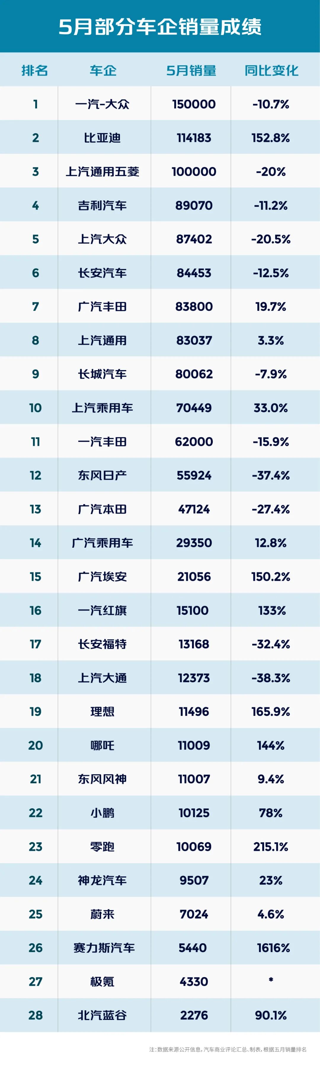 数据显示,5月,一汽集团乘用车生产环比增长178%,上汽集团乘用车生产环比增长150%,特斯拉生产33544辆,环比增212%。