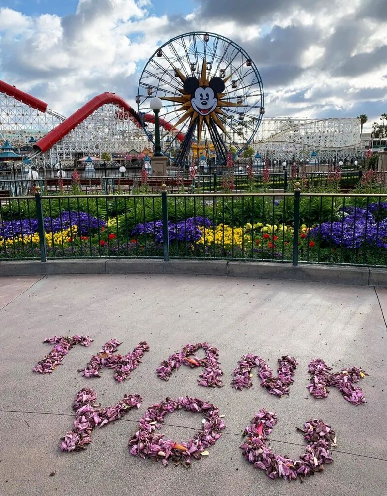 加州迪士尼乐园度假区,演职人员在迪士尼加州冒险乐园的皮克斯广场,以及华特先生的雕像前写下“谢谢”。