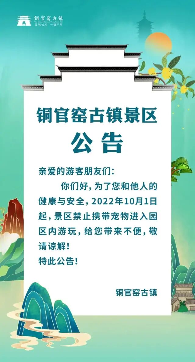 根据新华联铜官窑古镇景区公告,自2022年10月1日起,景区禁止携带宠物进入园区内游玩。