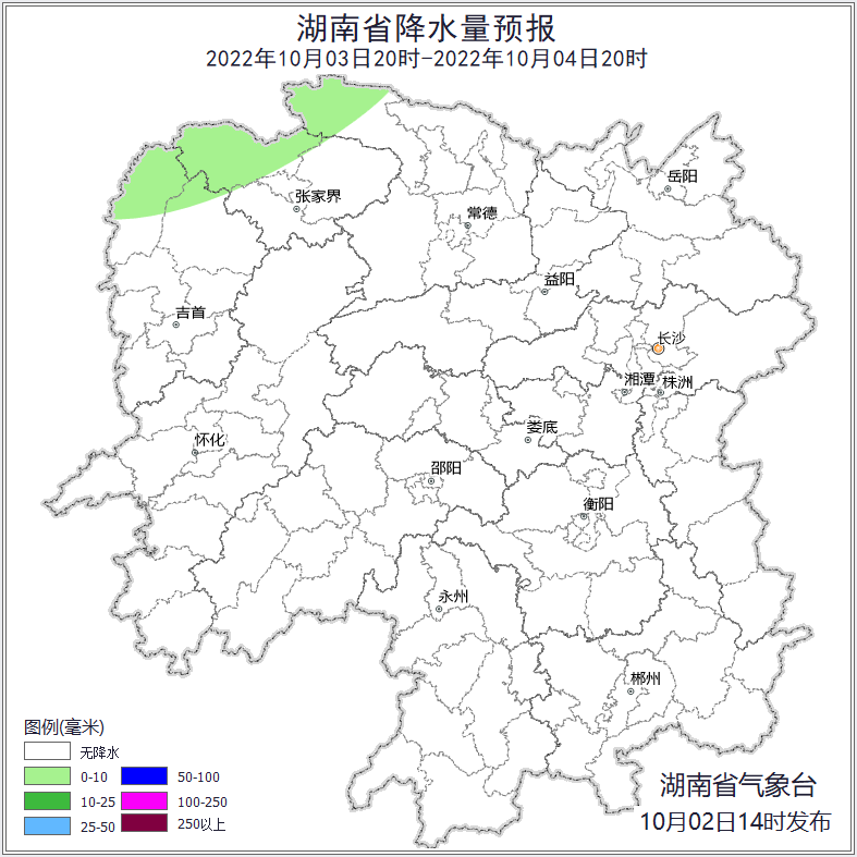 最早发布的寒潮预警(下半年)预计2日20时至3日20时,长沙(雨花区、高新区、长沙县、望城区、天心区、芙蓉区、开福区、岳麓区、浏阳市、宁乡市)、株洲大部分地区(醴陵市、天元区、云龙示范区、攸县、渌口区、荷塘区、石峰区、芦淞区、茶陵县)、湘潭(湘乡市、湘潭县、高新区、韶山市、岳塘区、雨湖区)、张家界东部(慈利县)、常德(德山经济开发区、津市、桃花源管理区、柳叶湖旅游度假区、桃源县、临澧县、西洞庭管理区、石门县、西湖区、鼎城区、汉寿县、安乡县、武陵区、澧县)、益阳(安化县、大通湖区、南县、桃江县、沅江市、资阳区、高新区、赫山区)、岳阳大部分地区(湘阴县、华容县、屈原管理区、平江县、岳阳楼区、汨罗市、临湘市)、怀化中北部(沅陵县、辰溪县、溆浦县、新晃县、芷江县、鹤城区、中方县、洪江市、洪江区)、娄底(涟源市、冷水江市、经开区、娄星区、新化县、双峰县)、邵阳东部(双清区、北塔区、大祥区、经开区、邵阳县、新邵县、隆回县、邵东市)、衡阳(珠晖区、衡阳县、南岳区、衡山县、衡南县、石鼓区、雁峰区、松木经开区、蒸湘区、衡东县、高新区、祁东县、常宁市、耒阳市)、永州北部(东安县、祁阳市、冷水滩区、金洞管理区、零陵区),郴州北部(永兴县、资兴市、安仁县)有37℃以上高温,局部地区将达39℃以上,请做好防范。10月2日20时至3日20时,晴天间多云;南风2~3级;最高气温37~39℃;最低气温湘西24~26℃,其他地区26~28℃。3日20时至4日20时,湘南晴天转多云,其他地区多云转阴天,其中湘西州北部、张家界北部、常德北部局地有阵雨或雷阵雨;南风2~3级转北风4~5级,江河湖面阵风7级;最高气温湘西北27~29℃,湘南35~37℃,其他地区31~33℃;最低气温湘北19~21℃,其他地区25~27℃。4日20时至5日20时,湘南多云,其他地区阴天,其中湘西州北部、张家界北部、常德北部局地有阵雨或雷阵雨;北风4~5级,江河湖面阵风7级;最高气温湘北16~19℃,湘南28~30℃,其他地区23~25℃;最低气温湘西北13~15℃,湘南19~21℃,其他地区16~18℃。气象专家提醒,注意做好保水节水和科学用水等抗旱减灾工作;此外,省内森林火险气象等级高,注意加强户外火源管控和火点监测等森林防灭火工作;关注4号开始的强冷空气过程带来的降温、大风等天气对交通、农业等的不利影响。来源:综合中国天气、湖南天气