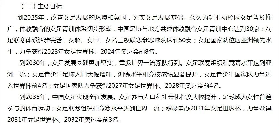 据国家体育总局网站24日消息,体育总局、教育部、财政部、中国足协印发了《中国女子足球改革发展方案(2022-2035年)》(以下简称《方案》)。《方案》提出,到2035年,中国女足实现全面发展。此外,中国将积极申办2031年女足世界杯,中国女足力争获得2031年女足世界杯、2032年奥运会前3名。图片来源:国家体育总局官网截图主要目标《方案》指出,到2025年,改善女足发展的环境和氛围,夯实女足发展基础。女足国家队位居亚洲领先水平,力争获得2023年女足世界杯、2024年奥运会前8名。到2030年,女足发展基础更加坚实,重返世界一流强队行列。女足联赛组织和竞赛水平达到亚洲一流;女足青少年足球人口大幅增加,训练水平和竞技成绩显著提升,女足青少年国家队力争进入世界杯前4名;女足国家队力争获得2027年女足世界杯、2028年奥运会前4名。到2035年,中国女足实现全面发展。女足参与人口和社会化程度大幅提升,足球成为女性普遍参与的体育运动;女足联赛组织和竞赛水平达到世界一流;积极申办2031年女足世界杯,力争获得2031年女足世界杯、2032年奥运会前3名。图片来源:国家体育总局官网截图主要任务《方案》强调加强女足国家队的建设和管理。统筹建立以女足国家队为龙头,U20女足国青队、U17女足国少队和U16、U15、U14、U13女足国家集训队有序衔接的大国家队体系,畅通选材渠道,实现各年龄段国家队压茬推进,压茬发展。实施“树对手”计划。坚持“请进来”,邀请一批世界高水平女足球员来华陪练、陪赛。鼓励各地积极举办女足国际赛事,办好山东潍坊杯、重庆永川四国赛等传统女足国际赛事,加快提升女足国家队竞技水平。实施“走出去”国际练兵计划。建立、完善国家队集训备战同职业联赛健康发展的协调机制。科学制定国家队比赛计划,加大赴海外拉练和比赛力度,每年至少参加30场国际赛事,通过与世界强队的高水平比赛磨砺队伍。加大女足球员海外发展政策和经费扶持力度,鼓励各级国家队队员参加高水平海外联赛。《方案》中表示,未来将实行中超俱乐部“男足带女足”发展模式。探索把建立女足职业俱乐部作为中超俱乐部的准入条件之一,并纳入中超俱乐部规范化建设综合排名的重要评估指标,推动女足职业化进程,提升女足联赛质量和品牌价值,扩大女足联赛影响力。此外,《方案》强调将大力发展女足青训、改革推进校园女子足球发展,并加快女足教练员队伍建设。据悉,将实施“百名精英女足教练员培养计划”。开通女足职业球员教练员培训绿色通道,开展女足教练员集中轮训,每年选送一批优秀教练员赴欧洲俱乐部长期轮流培训学习。到2025年,培养出100名扎根女足、执教能力强的教练员,承担女足各级青少年国家队执教和青训培训授课任务。