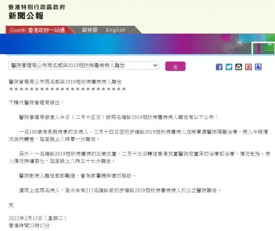 《星岛日报》称,该名女童是疫情两年来最年轻死亡病例,也是不足一周内第二名幼童染疫死亡。