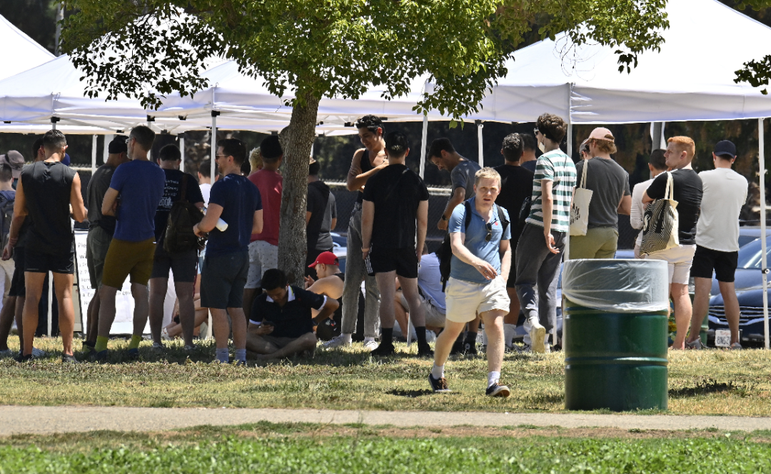 8月6日,美国加州,人们在巴尔博亚公园的猴痘接种诊所前排起了长队。