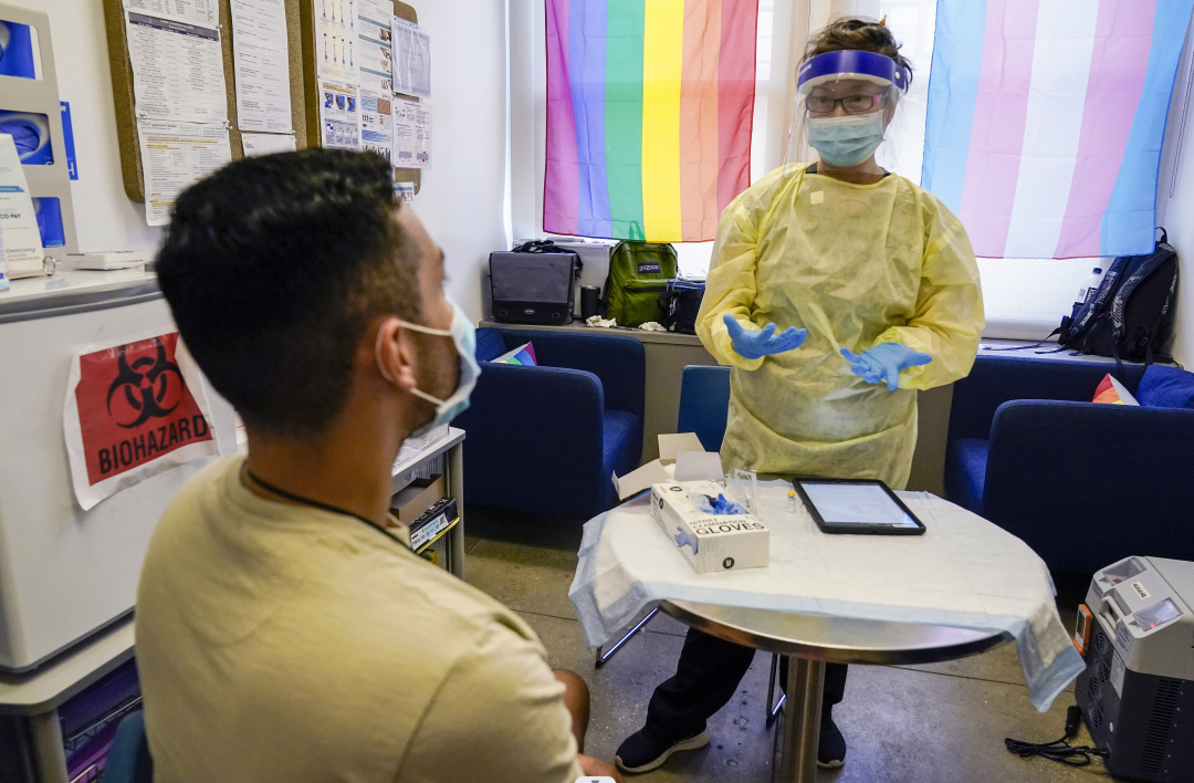 8月19日,美国纽约,医生助理向一名患者说明猴痘疫苗可能的副作用。