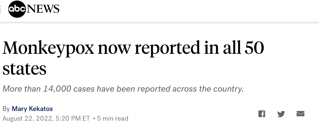 据最新报道,截至当地时间22日,美国全部50个州都已出现猴痘病例,怀俄明州是最后一个报告猴痘病例的州。
