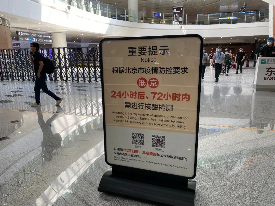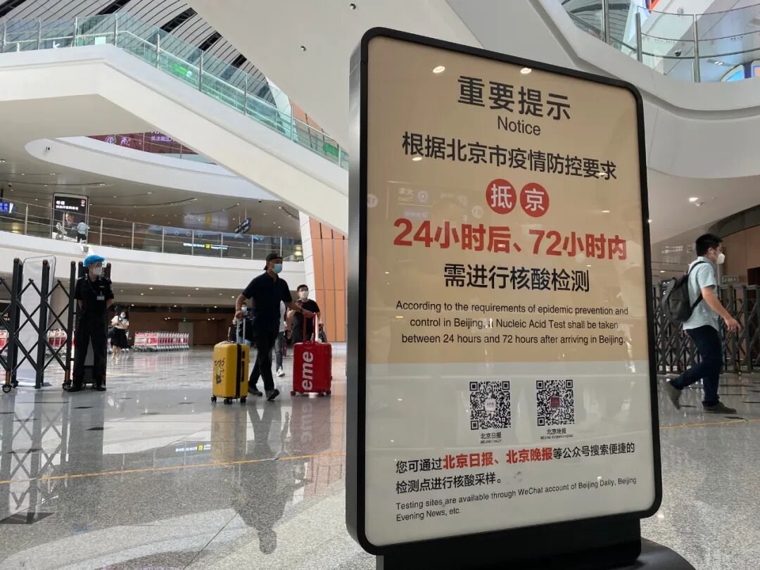 近日,大兴机场航站楼东、西两个国内到达口更换了新版提示牌。新提示牌增加了北京日报、北京晚报微信公众号二维码,旅客扫码关注北京日报、北京晚报微信公众号,进入“北京核酸检测地图”,即可查询最近的核酸检测点。