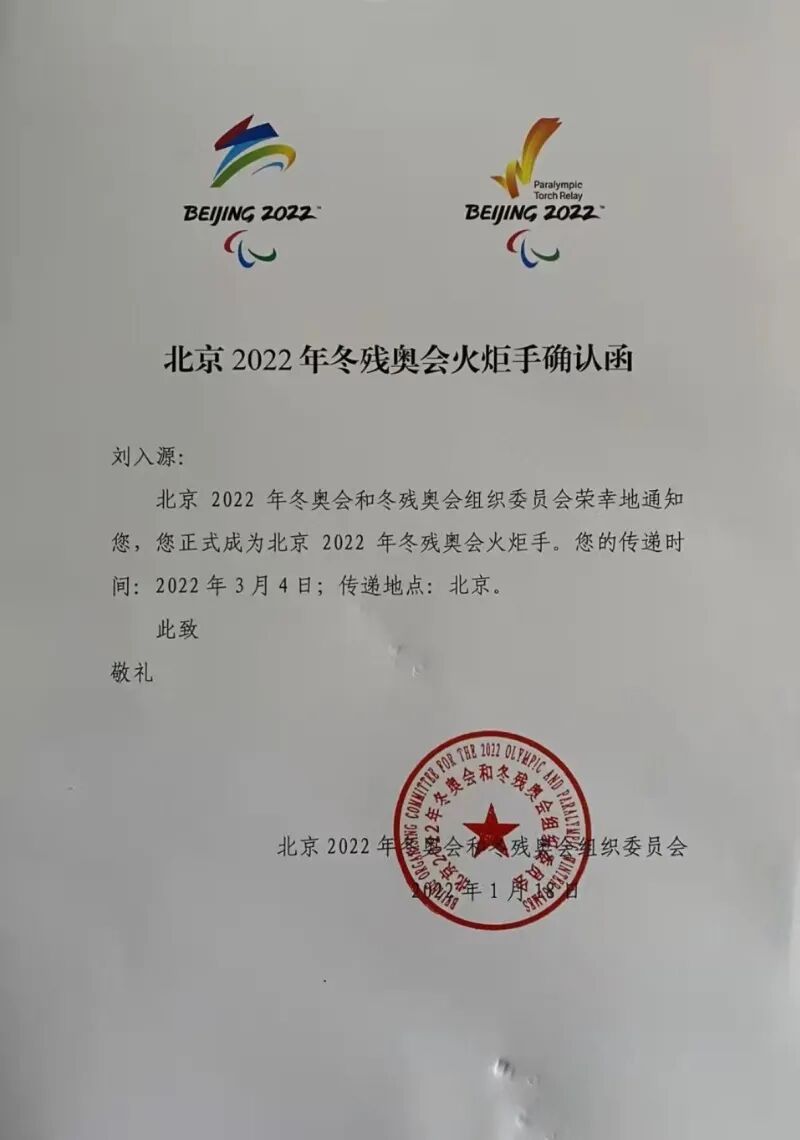 得知自己成为北京冬残奥会火炬手后,刘入源非常激动,他表示:“作为火炬手,不仅要将火炬传递的任务完成好,还要带头传播奥运精神,宣传奥运知识。我希望通过这次火炬传递,这团爱心之火能够照亮和帮助到更多需要帮助的残疾人朋友。”