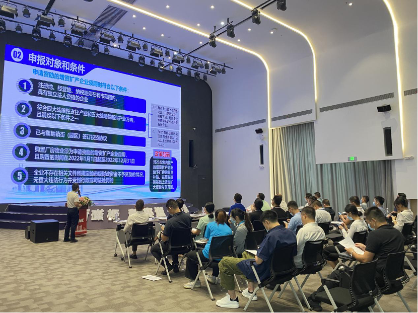7月8日,为加大对2022年东莞市增资扩产企业购置厂房补贴政策的宣传力度,黄江镇投资促进中心于天集产城·莞深协同创新中心召开政策宣讲会。