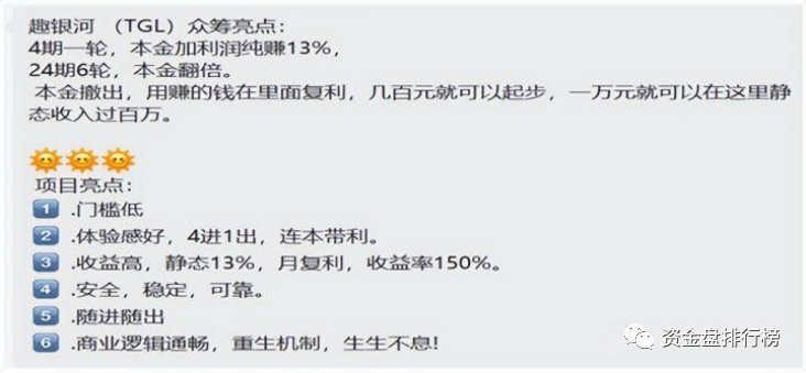 第1期1000U起筹,1U起步,20U为一个有效账户,第2期为1300U,你参与额为25U,第3期为1690U,你再参与额为30U……以此类推,通过众筹、复利、重生机制,宣称无风险投资,仅静态收益版块,保守计算1个月你就可以获得2倍收益,2个月4倍,3个月8倍,4个月18倍,7个月240倍收益...投资1万元,7个月变240万...动态奖金方面,目前共有11位V6,仅加权部分每天分红上百万...你觉得可信吗?qian 这么容易来,也带带我好不好?这个张冬冬把自己包装的蛮好的,有这心思找人做形象定位,还不如早点进局子,以后出来也早点。“趣银河”TGL近期提现困难,如果你关注了该项目,赶紧跑吧!一END一