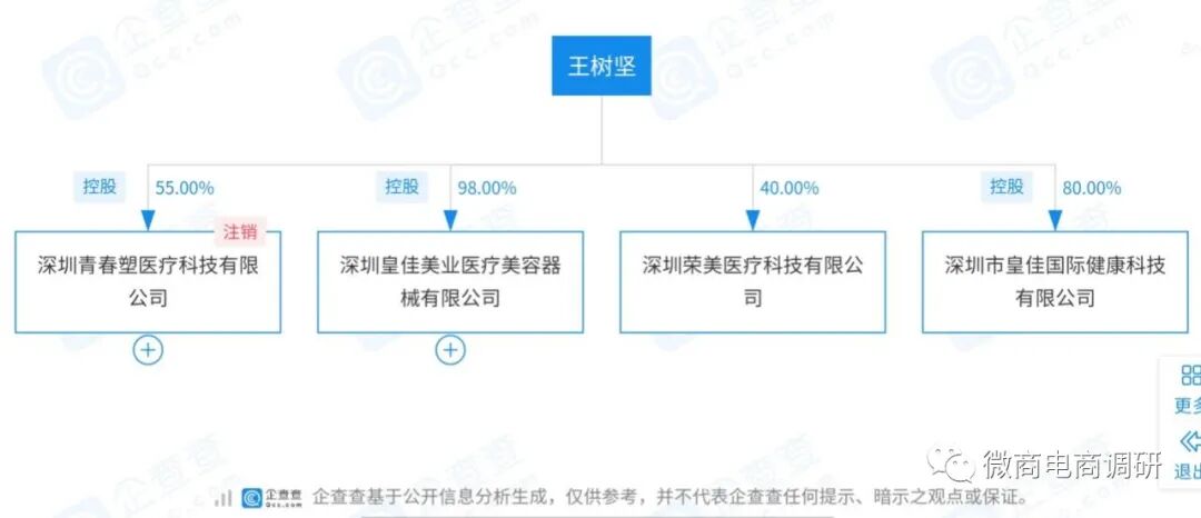 根据企查查APP显示,王树坚和5家企业有关联。王树坚不仅是深圳皇佳美业医疗美容器械有限公司董事长,还投资了深圳荣美医疗科技有限公司,持股比例为40%并担任监事;投资了深圳市皇佳国际健康科技有限公司,控股80%并担任监事;投资了深圳青春塑医疗科技有限公司,控股55%并担任监事(该公司已注销);在深圳皇佳翼美医疗美容门诊部担任总经理一职。