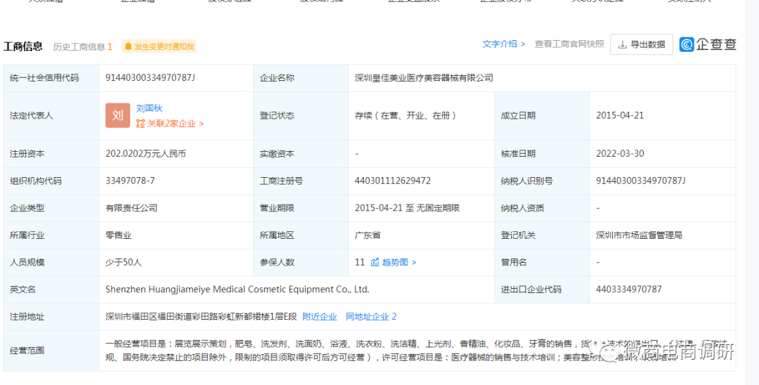 皇佳翼美隶属于深圳皇佳美业医疗美容器械有限公司。企查查APP显示,深圳皇佳美业医